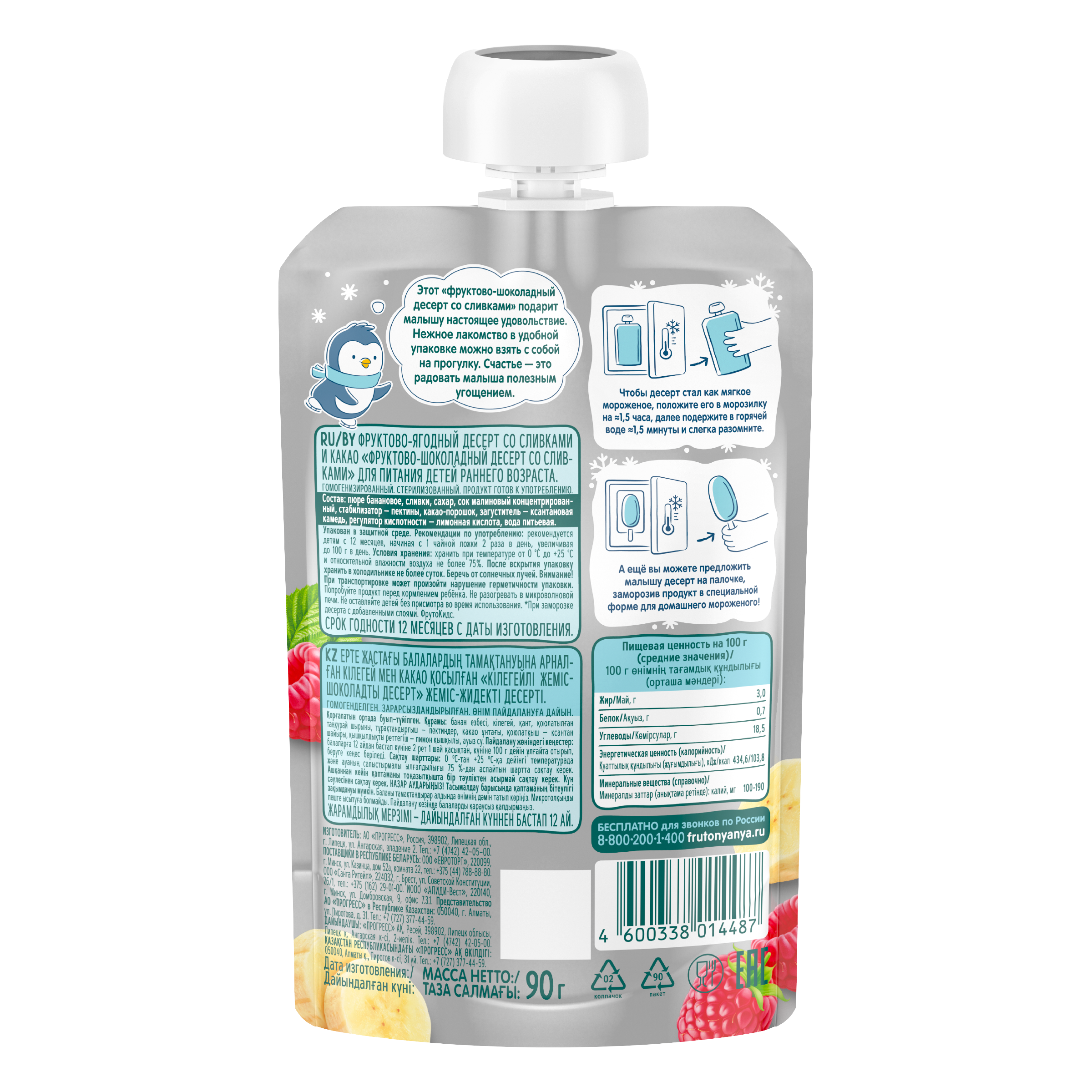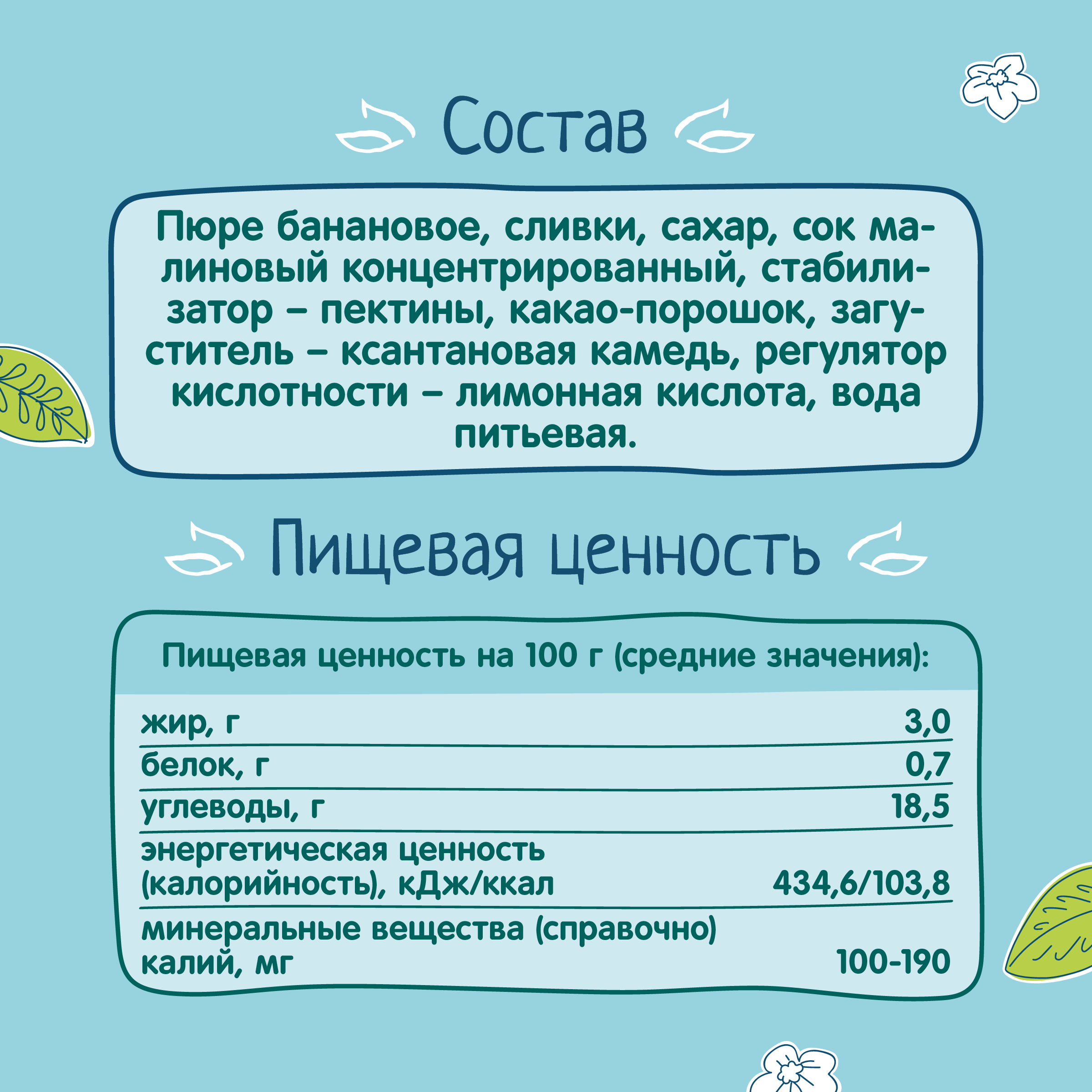 пюре банановое, сливки, сахар, сок малиновый концентрированный, стабилизатор — пектины, какао-порошок, загуститель — ксантановая камедь, регулятор кислотности — лимонная кислота, вода питьевая