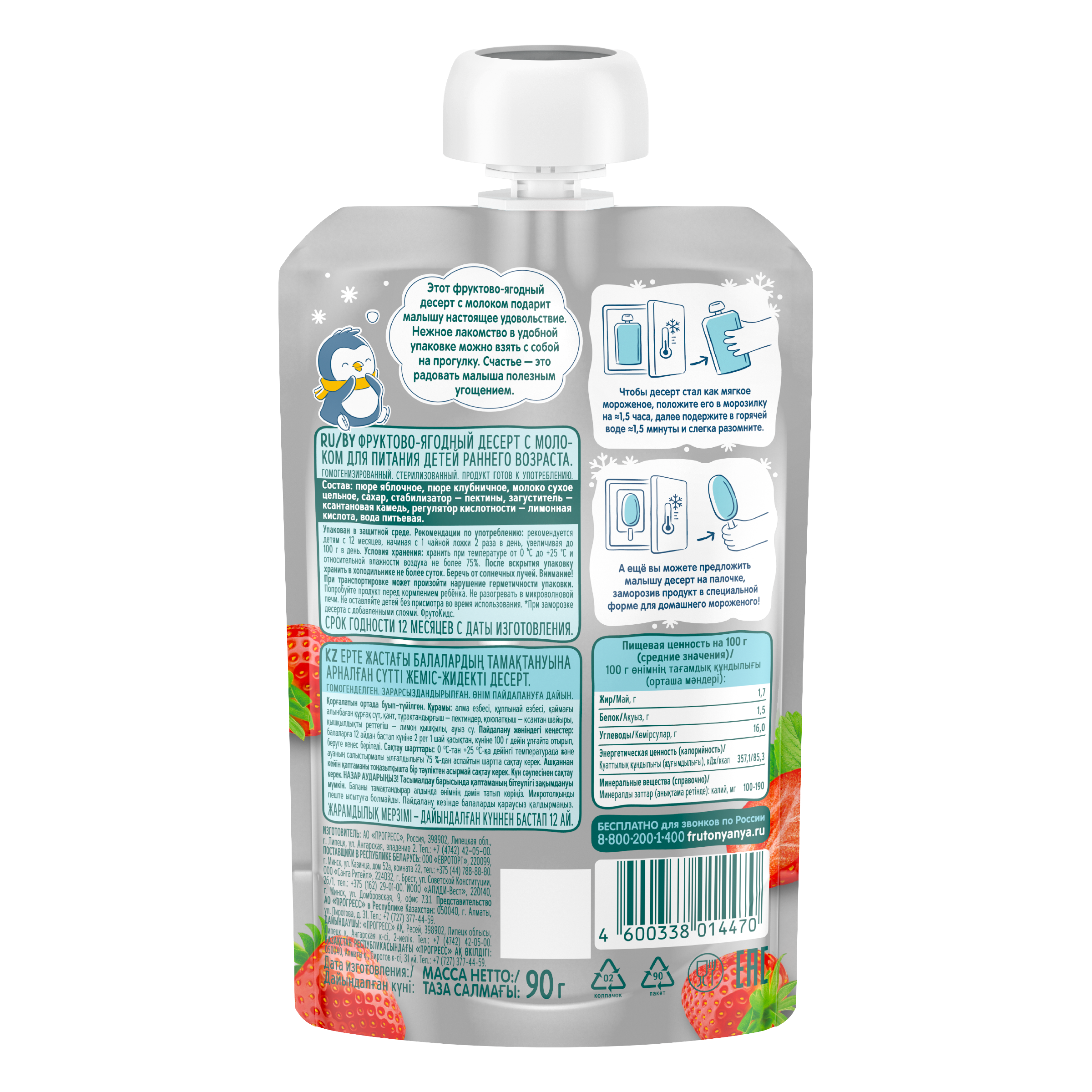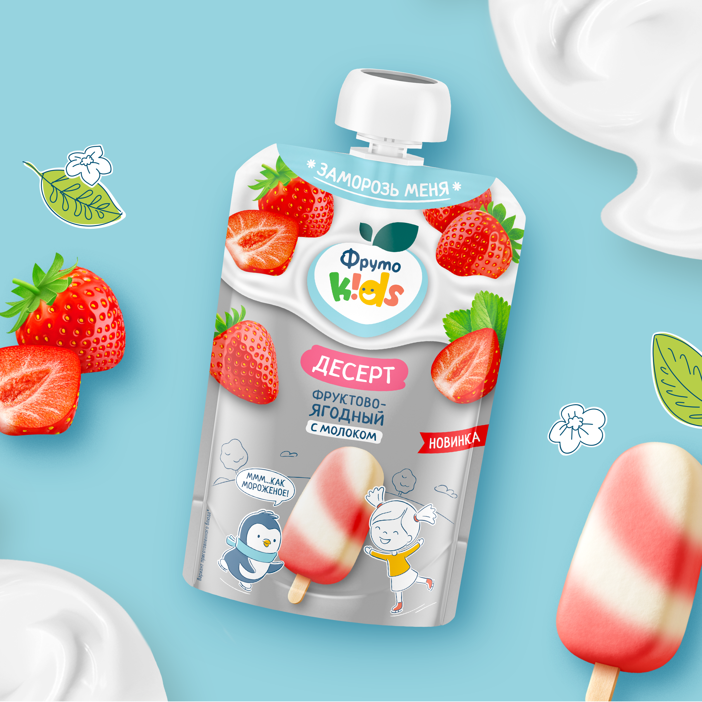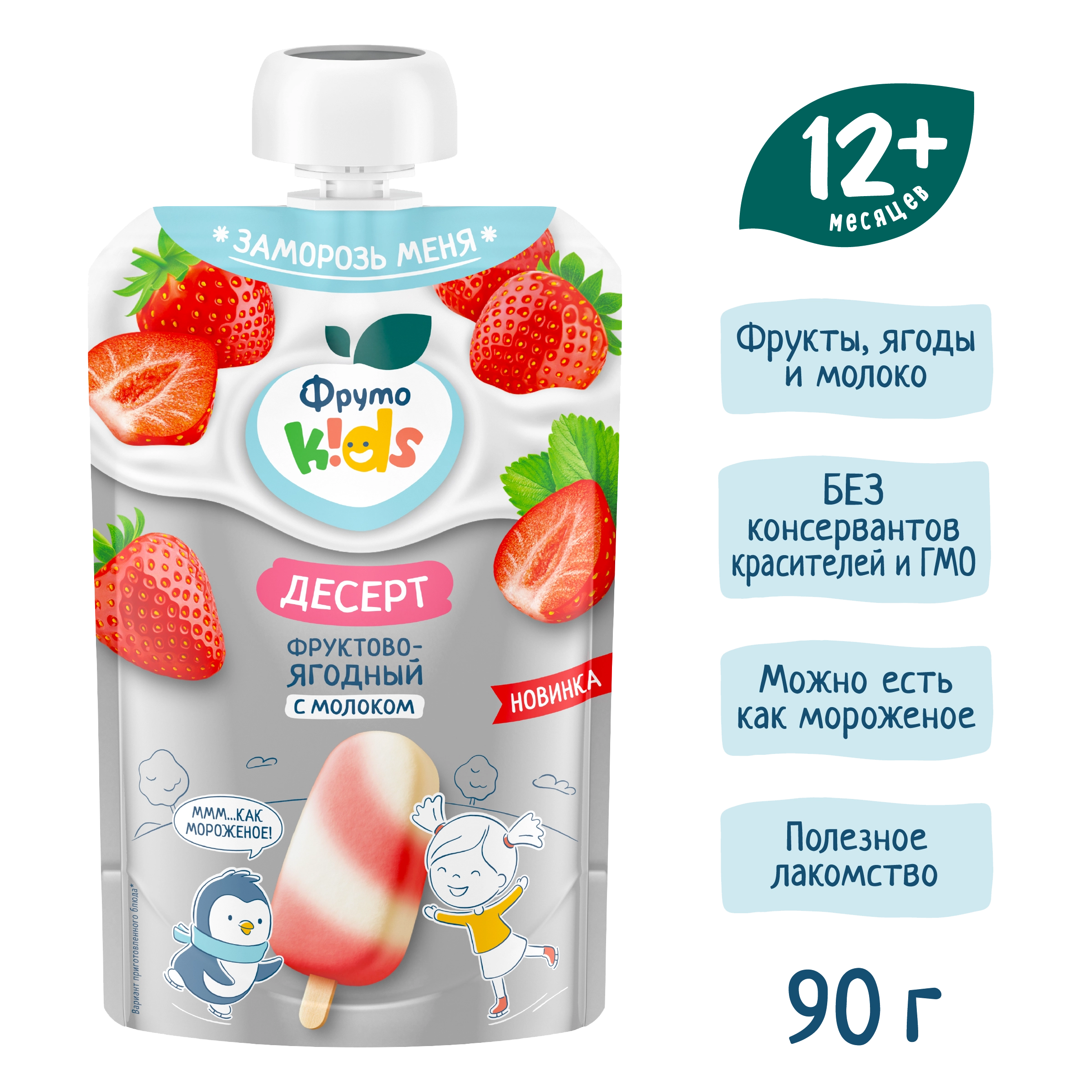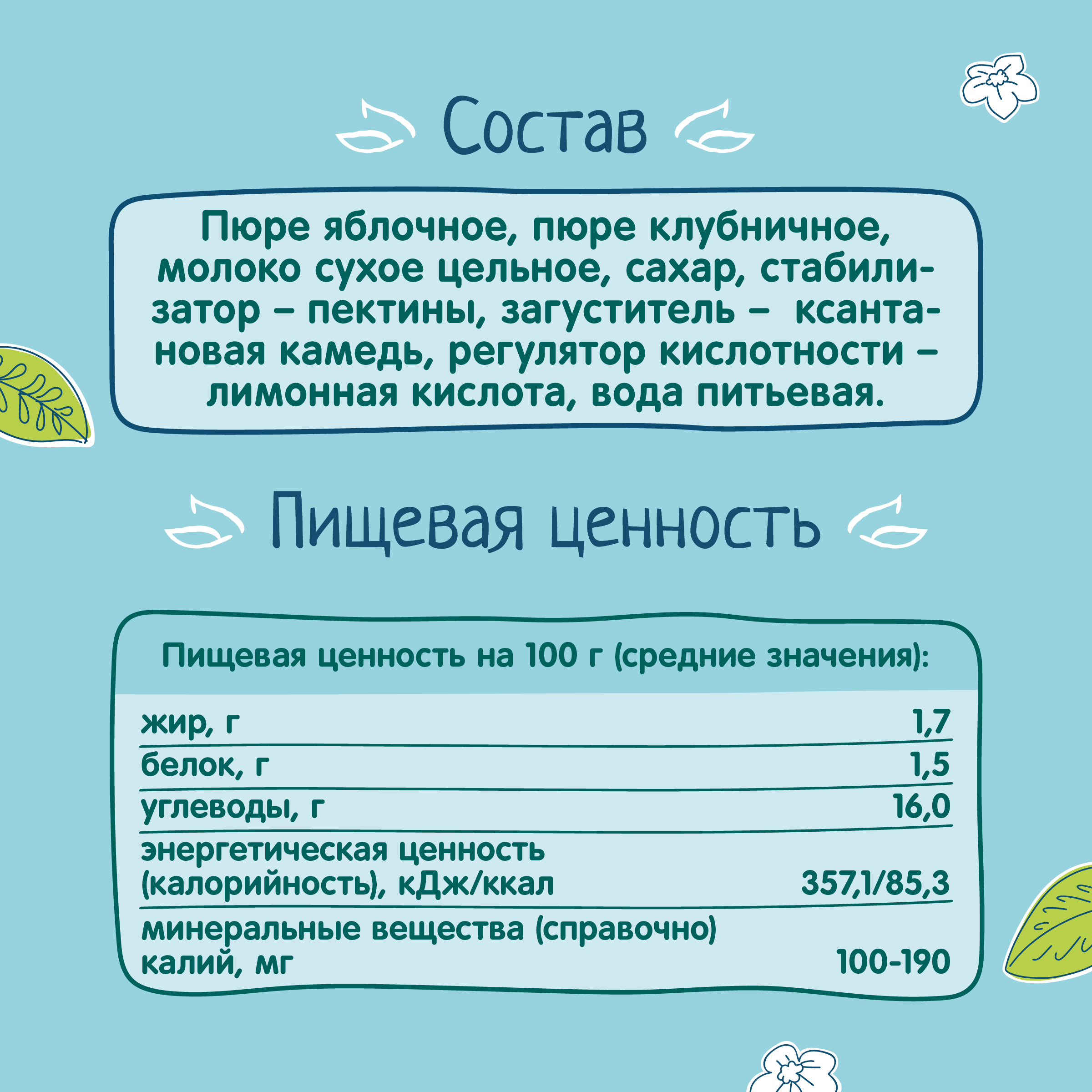 пюре яблочное, пюре клубничное, молоко сухое цельное, сахар, стабилизатор — пектины, загуститель — ксантановая камедь, регулятор кислотности — лимонная кислота, вода питьевая