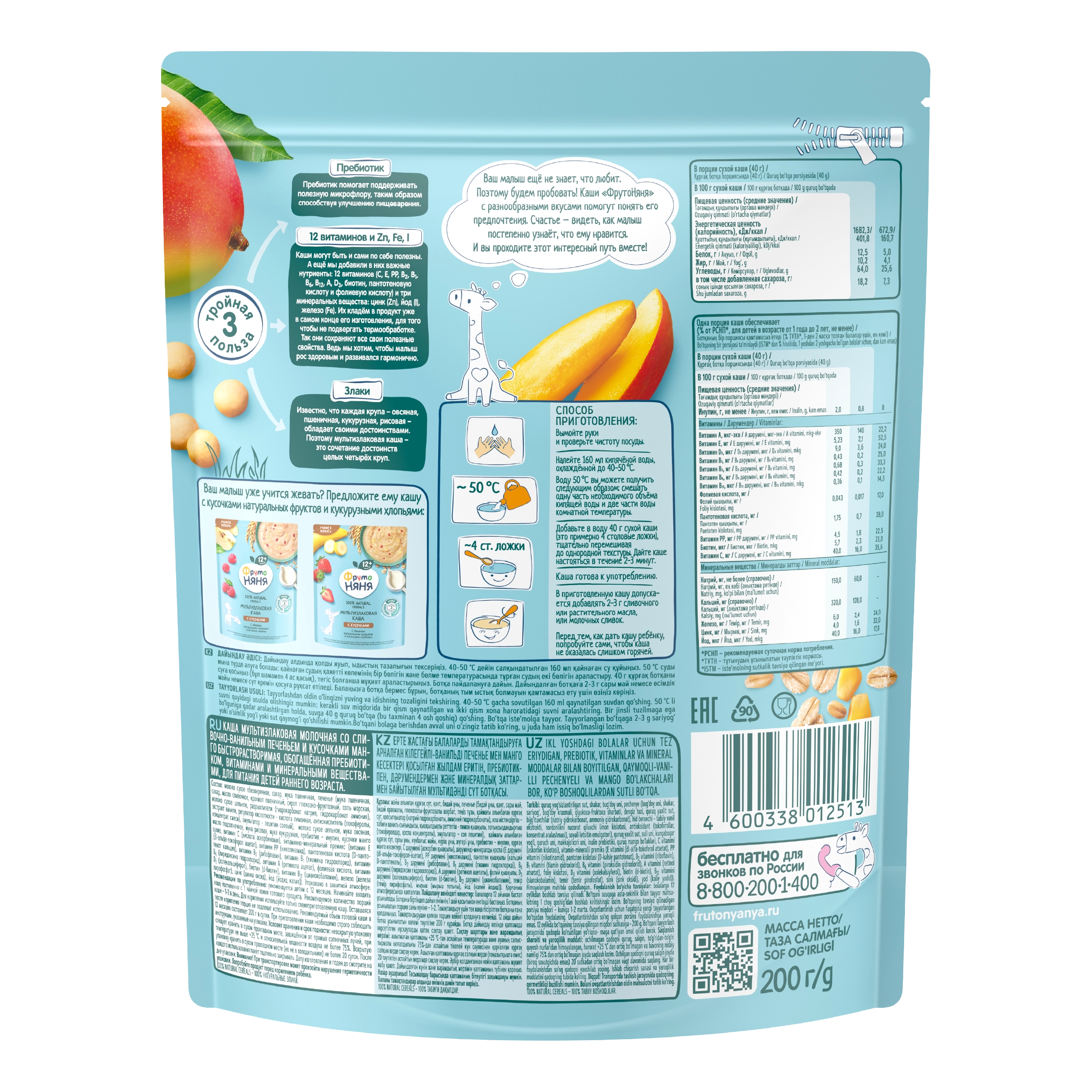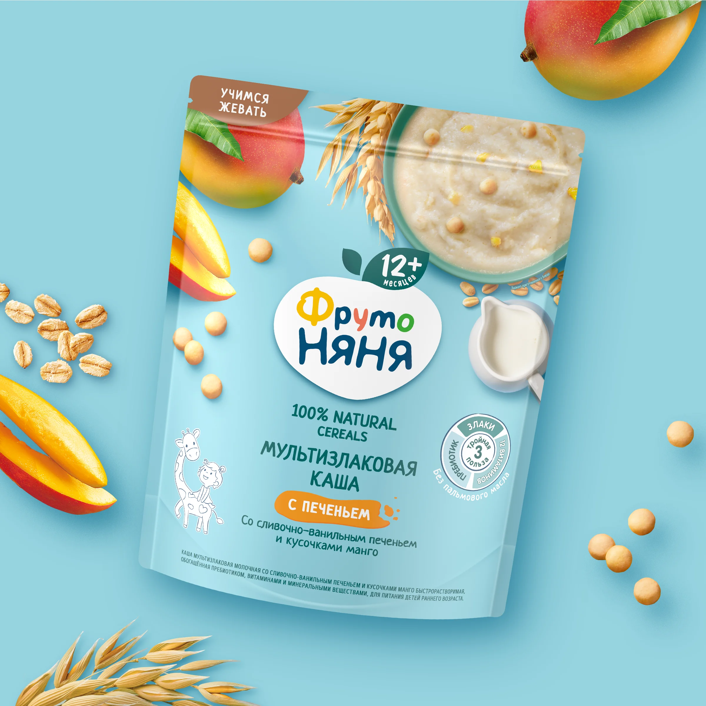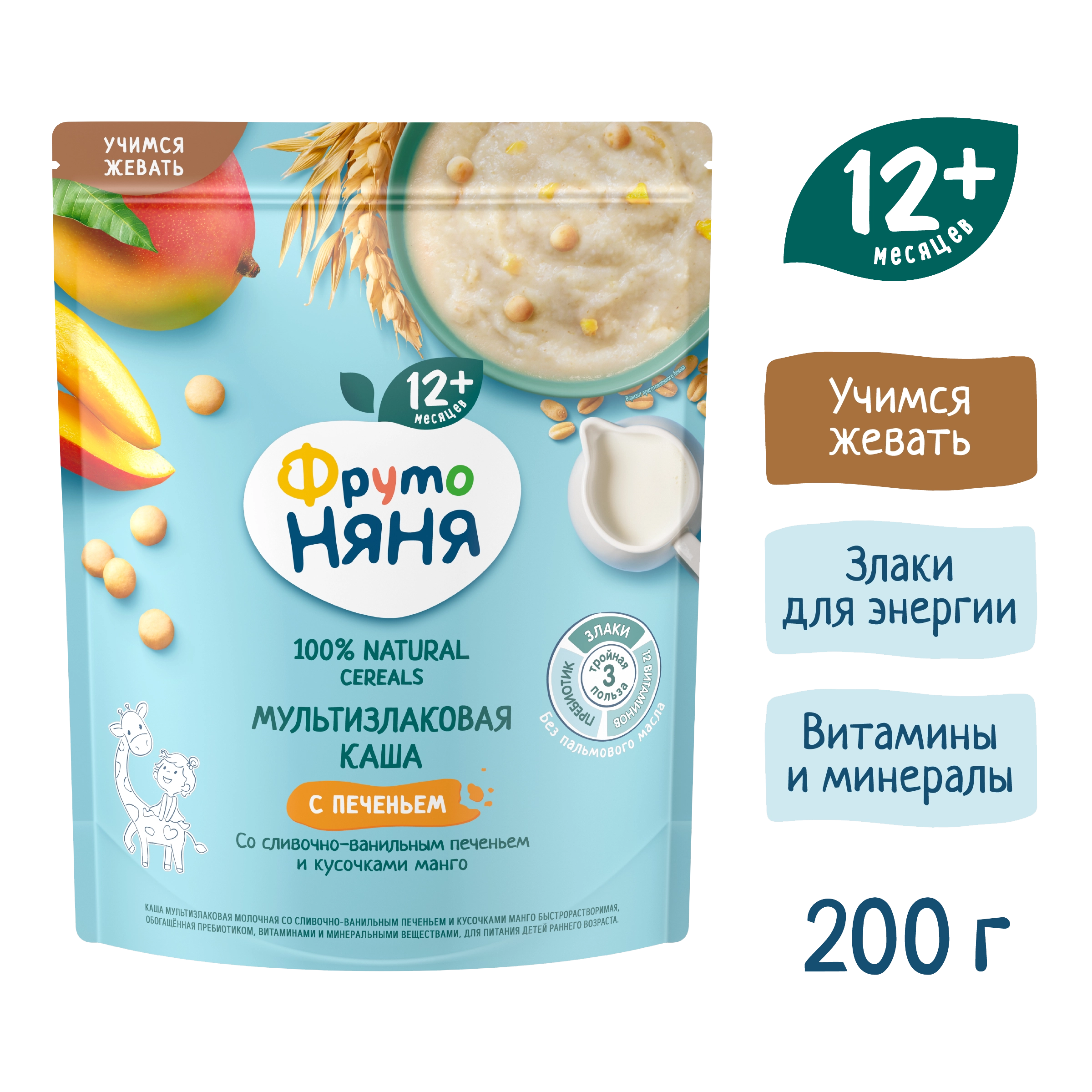 Сухая молочная мультизлаковая каша со сливочно-ванильным печеньем и кусочками манго «ФрутоНяня» — полезный и вкусный завтрак для детей старше 12 месяцев. Натуральные злаки обеспечивают сытость, а кусочки печенья и тропического манго помогают развивать жевательные навыки и дарят новые сенсорные ощущения.