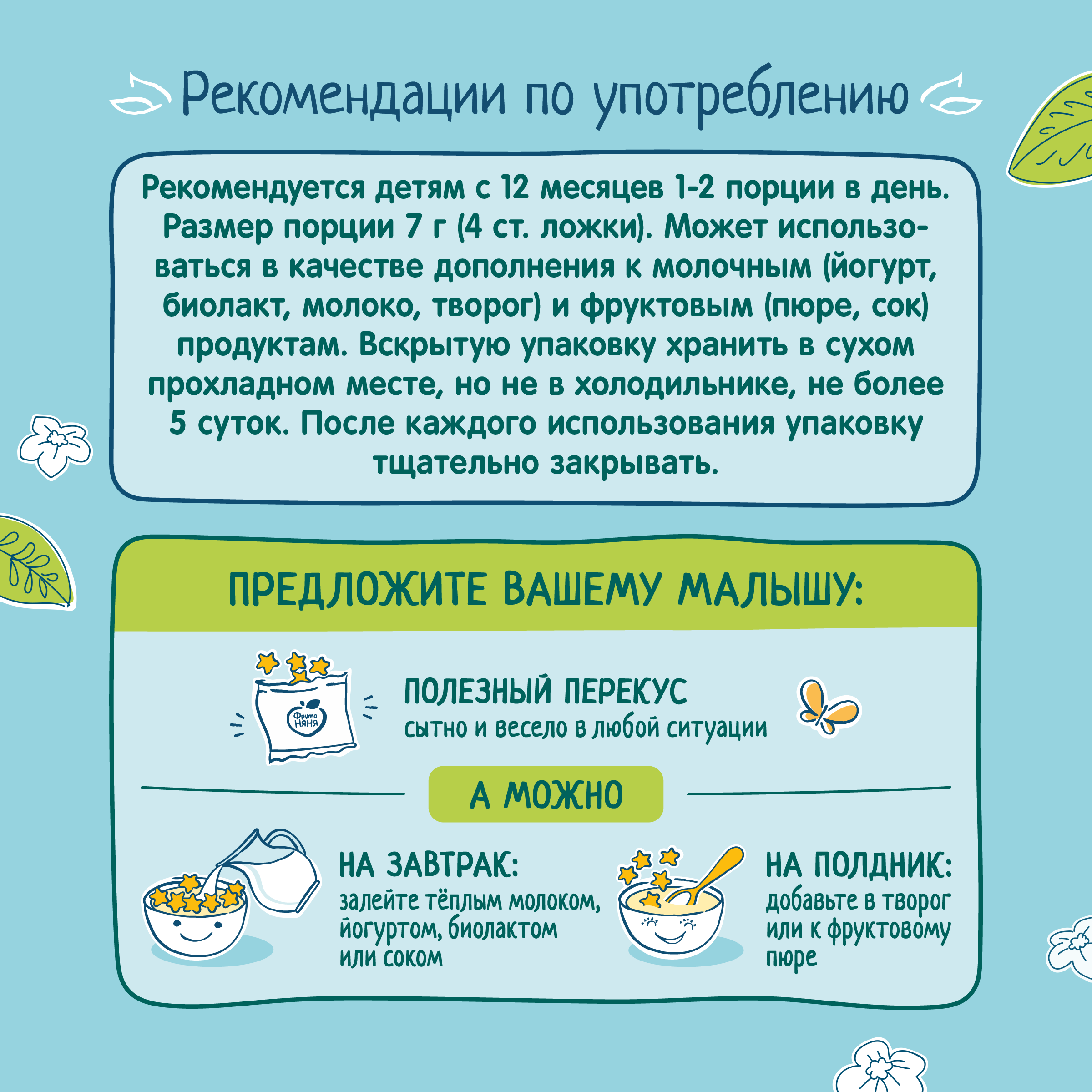 Рекомендуется детям с 12 месяцев 1-2 порции в день. Размер порции 7 г (4 ст. ложки). Может использоваться в качестве дополнения к молочным (йогурт, биолакт, молоко, творог) и фруктовым (пюре, сок) продуктам. Вскрытую упаковку хранить в сухом прохладном месте, но не в холодильнике, не более 5 суток. После каждого использования упаковку тщательно закрывать.
